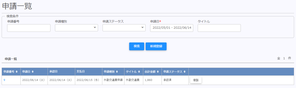 | 複製 | 同内容の申請を作成する事ができます。 複製元の明細に添付があった場合、添付は複製されません。 |