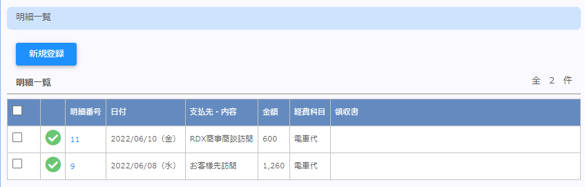 | 新規登録 | 新しい明細を作る事ができます。 この画面から明細を作成する場合は新規登録押下時点でセットされていた申請種別で固定されます。 |