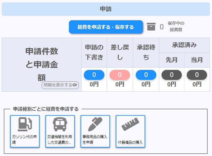 | 経費を申請する・保存する | 登録した申請のステータスごとに件数を表示します。 登録済みの申請や明細は「申請一覧」「明細一覧」から確認できます。 |