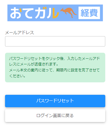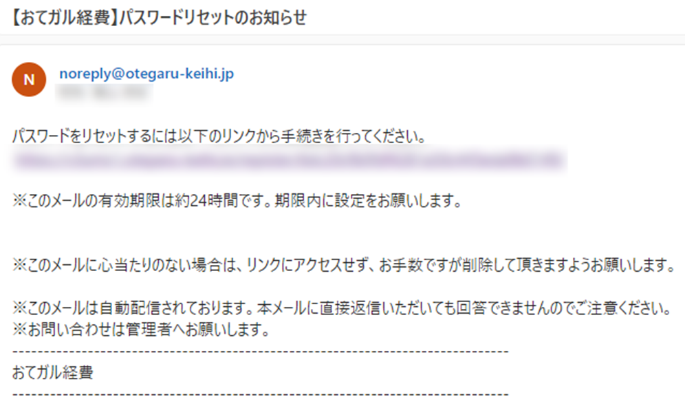 該当するメールアドレスを入力しパスワードリセットを押すと、入力されたアドレス宛に「【おてガル経費】パスワードリセットのお知らせ」が届きます。