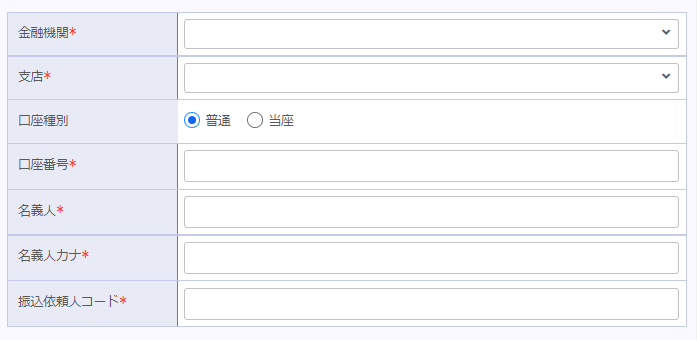 | 支店 | 金融機関に紐づく支店をセットします。 |