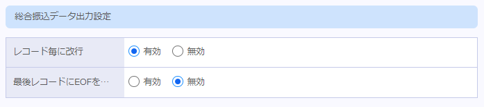 | 最後レコードにEOFを付与 | 総合振込振込データを出力する際、最後レコードにEOFを付与する場合は「有効」を選択します。 ※EOFとはファイルの終わりを意味します。 |