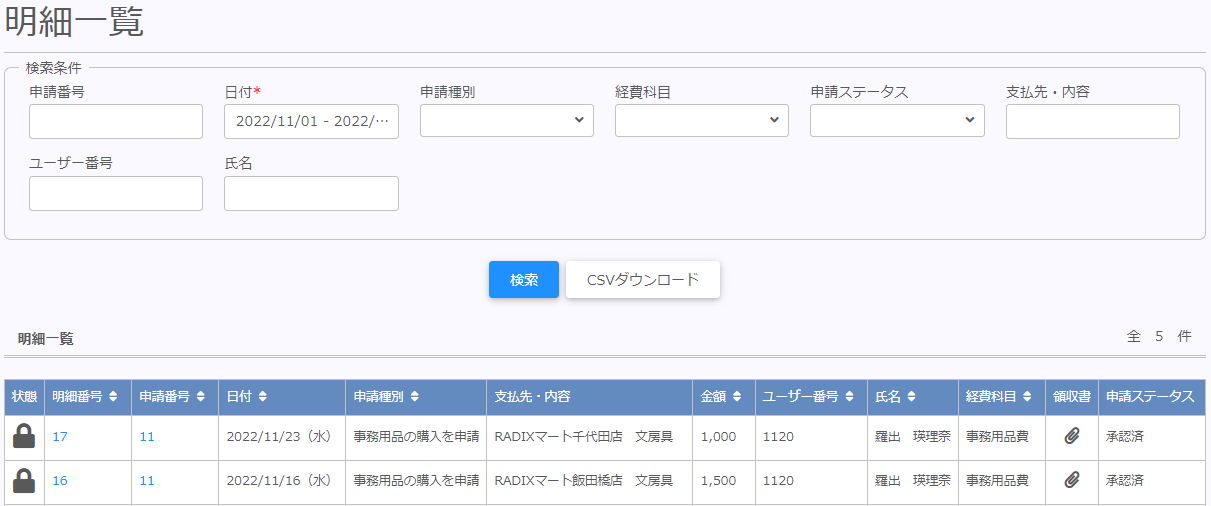 申請前後・承認前後に関わらす、全ての明細データを確認する事ができます。