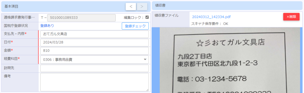| 領収書 | ファイルが添付されている場合はファイル名を押下する事でプレビュー表示する事ができます。 |
