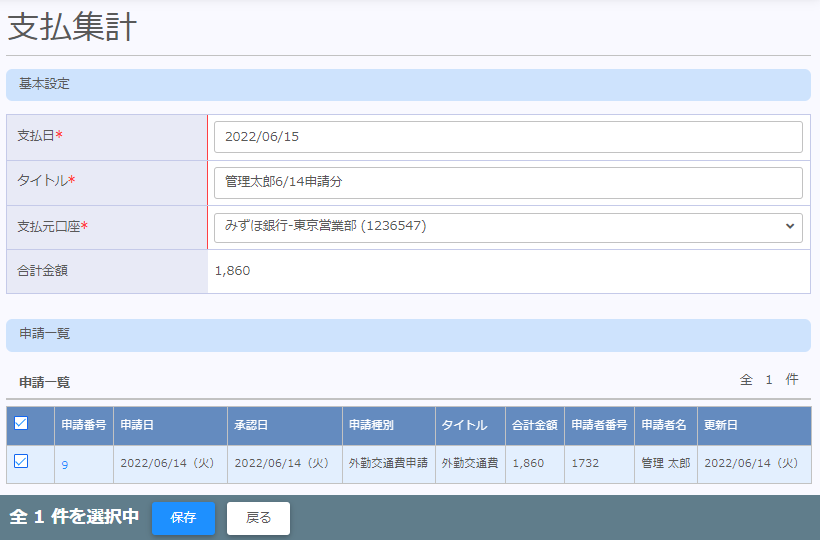 支払処理は複数の承認された申請に対し、まとめて行う事が可能です。