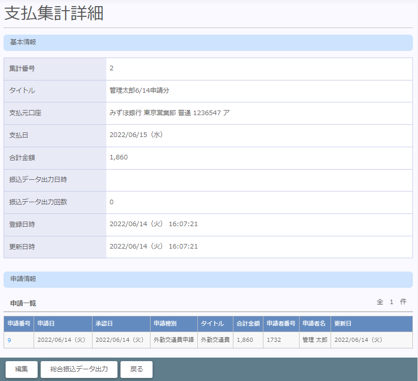 | 編集 | 申請内容の編集を行います。 タイトルの変更や明細の編集・追加ができます。 |