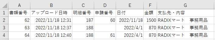 申請内容を明細毎に「日付(取引年月日)」「金額(取引金額)」「支払先・内容(取引先)」等の検索をする事ができます。