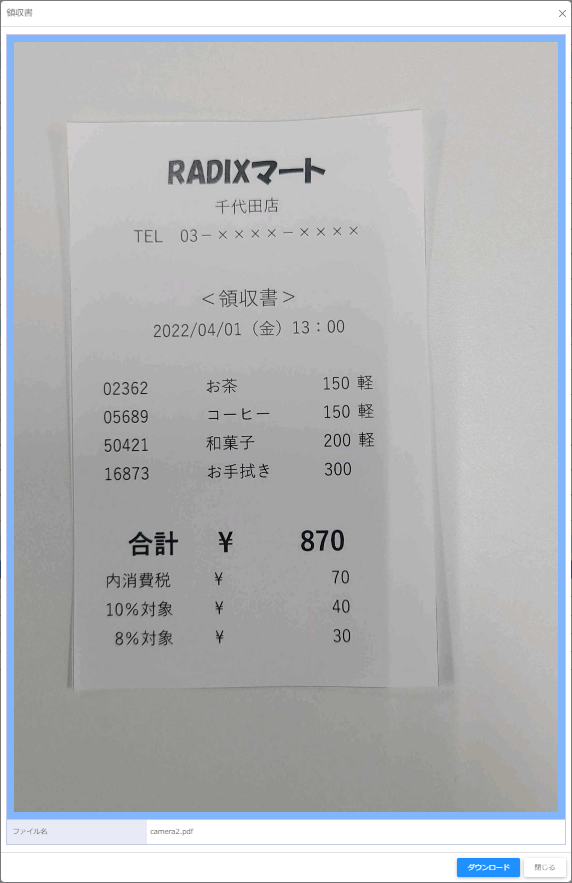 | ファイル名 | クリックにて添付ファイルのプレビューが表示されます。 拡大・縮小、全画面印刷は各種ブラウザの機能をご利用頂きます。 ※プレビュー時の表示解像度の初期値は以下となります。 ・縦画像の場合 1089×1540 ・横画像の場合 1089×770 ※印刷するプリンターは200dpi以上、RGB256階調相当以上の製品をご利用ください。 ※等倍サイズでの印刷の場合、「実際のサイズ」を選択してください。 ※拡大・縮小印刷が必要な場合、用紙サイズに合わせて「カスタム倍率」を設定してください。 ※プレビューされたファイルはダウンロードする事ができます。 分割してアップロードをされた証憑を分割せずに印刷を行う場合、ダウンロードをしたPDFファイルを、PDF編集ソフト等でサイズ調整を行いました上、印刷をしてください。 |