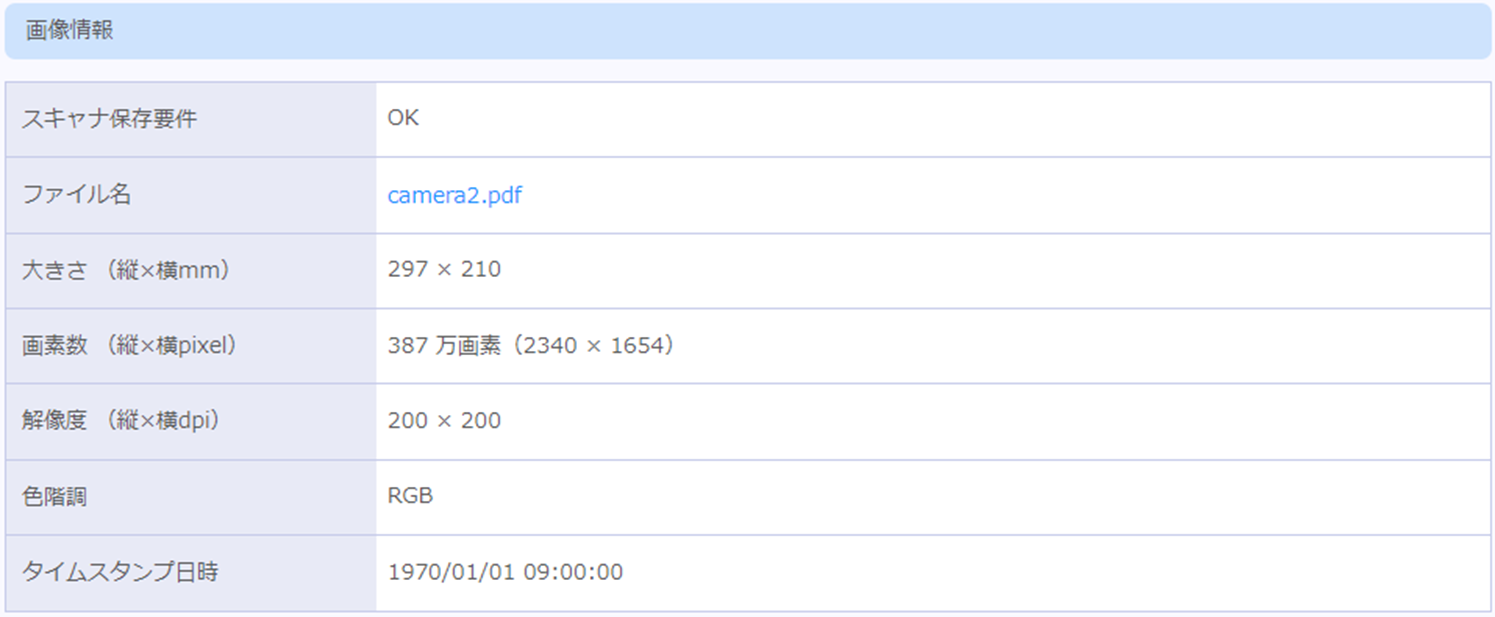 | タイムスタンプ日時 | 「スキャナ保存要件」が「OK」の場合はタイムスタンプが押印された日時、「NG」の場合はスキャナ保存要件の判定が行われた日時となります。 |