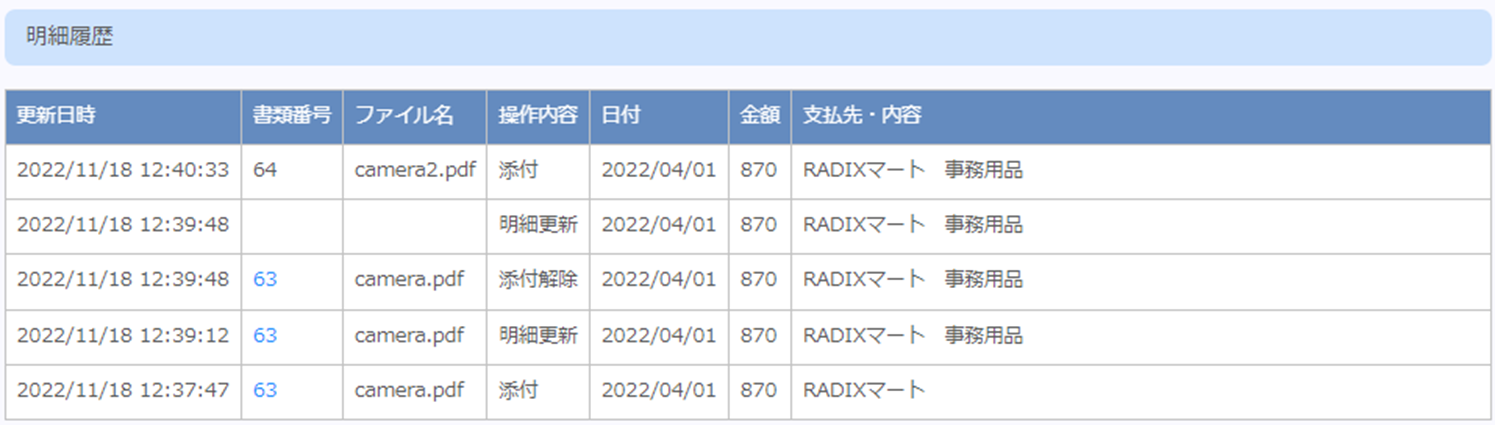 明細に対して添付されたファイルの、変更履歴を確認する事ができます。