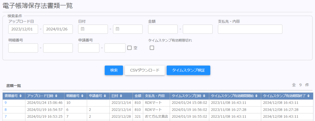 | タイムスタンプ検証 | 書類一覧に表示されている明細の、タイムスタンプの状態を検証します。 検証結果タブにて結果を確認する事ができます。 |