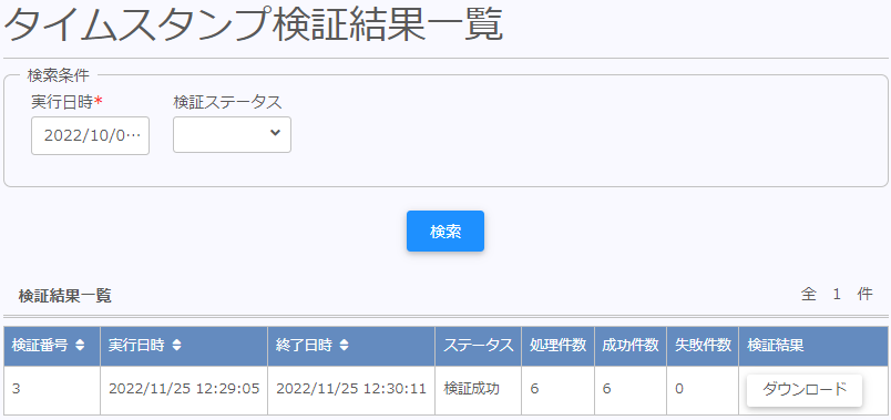| 検索 | 「実行日時」「検証ステータス」で指定した条件にて検索をかけます。 |