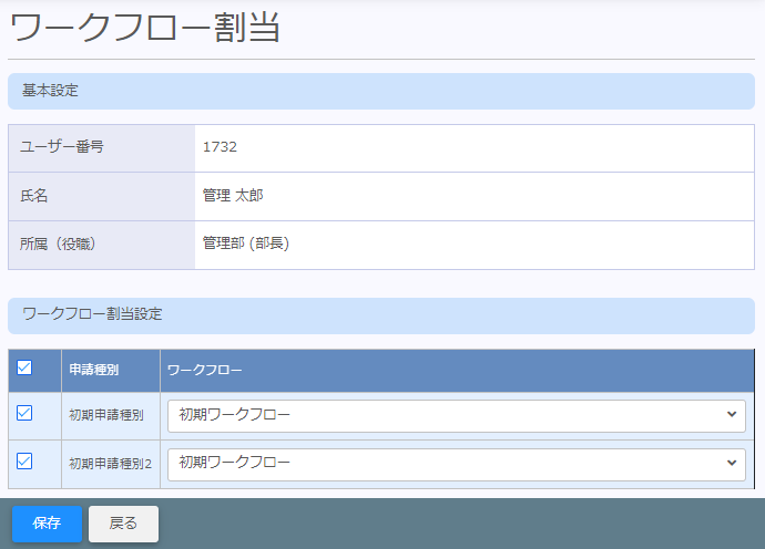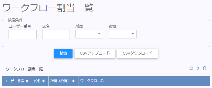 ワークフロー割当タブ 概要説明ユーザーが申請を上げる際、申請種別毎にどのワークフロー(承認経路)を辿るのかを設定します。 ご利用可能なユーザーユーザー設定にてシステム設定が「有効」になっているユーザー。 ご利用方法 ワークフロー割当のトップ画面です CSVアップロードCSVファイルで作成したワークフロー割当をインポートできます。CSVダウンロードインポート用のCSVファイルをダウンロードできます。 チェックボックス利用する申請種別の明細にチェックを付けます。項目名のボックスにチェックを入れる事で、全ての明細にチェックを付ける事ができます。ワークフロー申請種別毎にワークフローをセットする事ができます。
