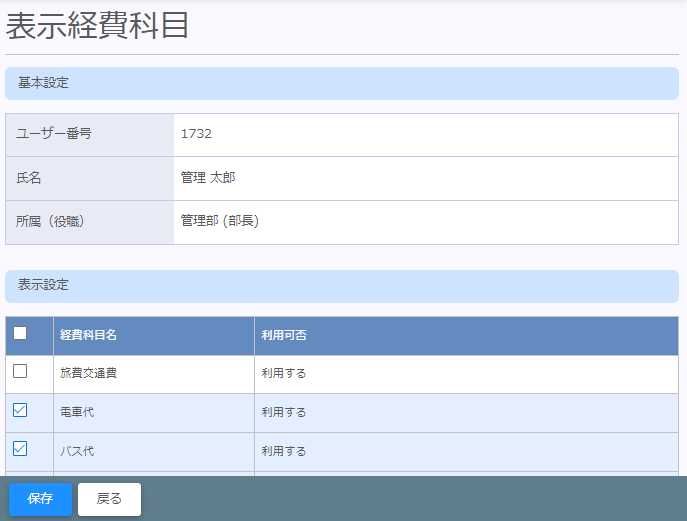 | チェックボックス | 表示対象となる経費科目にチェックを付けます。 項目名のボックスにチェックを入れる事で、全ての経費科目にチェックを付ける事ができます。 利用可否が「利用しない」になっている場合はチェックを付ける事ができません。この設定変更は科目設定の経費科目で行います。 |