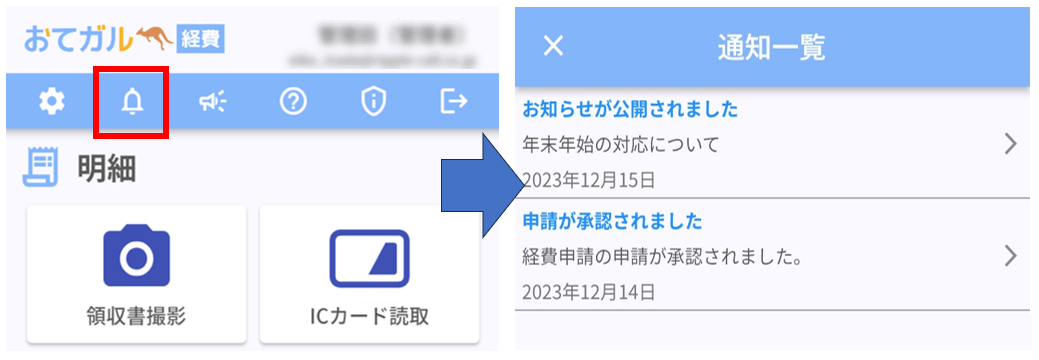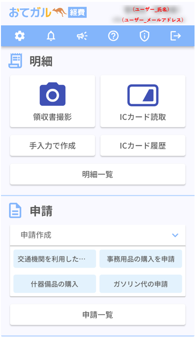 明細・申請・承認メニューのうち権限のある機能がTOP画面に表示されます。