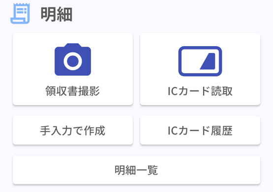| ICカード読取 | 交通系ICカードに保存されている利用情報から、明細を作成します。 ※モバイルアプリの読取はこちら。 |