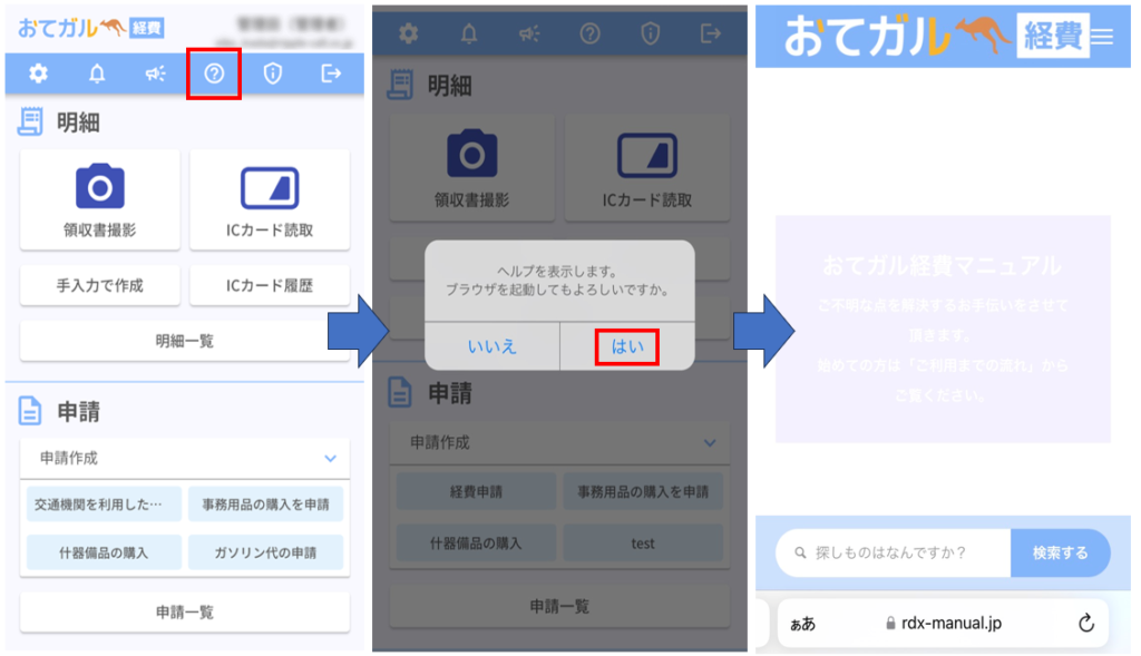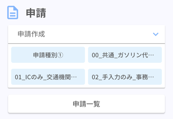 | 申請作成 | 申請種別を選択し、経費を申請します。 「∨」をタップすると利用できる全ての申請種別が表示されます。 |