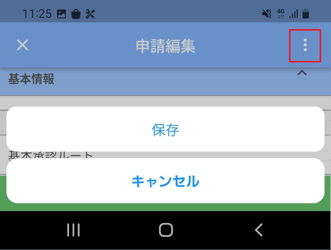 申請作成の画面を一時的に保存される場合は右上の三点リーダーをタップし、保存をタップします。