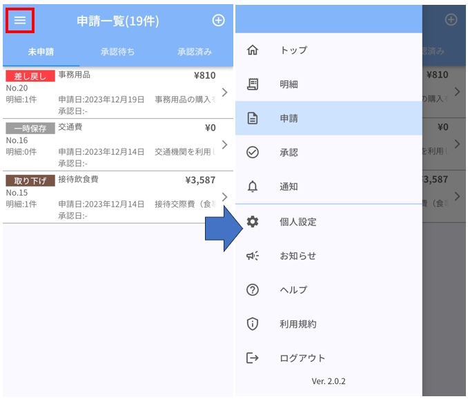 ※「≡(ハンバーガー)」ボタンから開いたメニューの「申請」をタップした場合も同一画面が開きます。