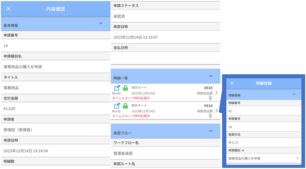 明細一覧の明細をタップすると、添付している明細の「明細詳細」を表示することも可能です。