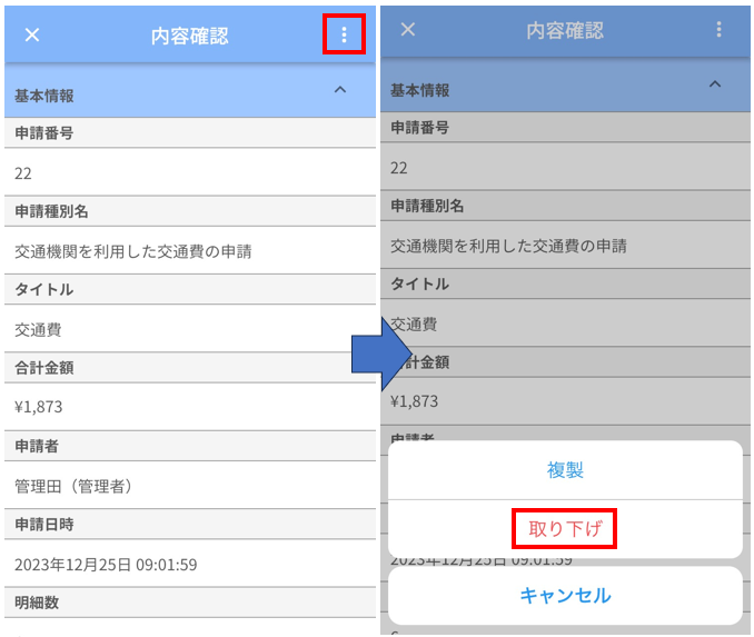 | 「承認待ち」状態の申請データを展開 | 選択肢が「複製」「取り下げ」になります。 |