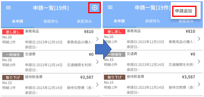 「申請追加」をタップすると新規の申請を作成できます。