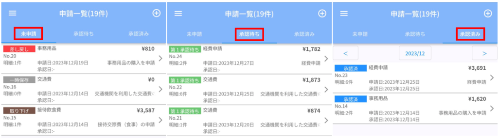 登録した申請を「未申請」「承認待ち」「承認済み」のステータスごとに一覧で確認できます。