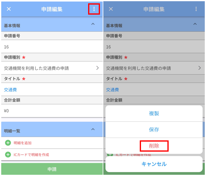 「削除」をタップすると対象の申請は削除されます。
