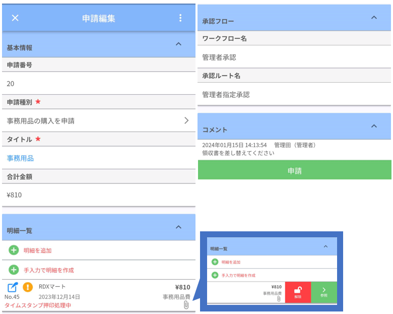 添付された明細をタップすると、「解除」「参照」ボタンが表示されます。