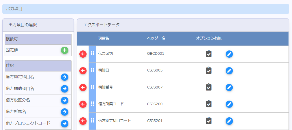 | エクスポートデータ | 表示された順でCSVデータが出力されます。 項目名はおてガル経費上での名称となり、ヘッダー名はCSV出力をした際のヘッダー名称となります。 【赤矢印】 「出力項目の選択の明細」に選択した項目を戻します。 【ドラッグボタン】 順番を変更します。 ドラッグ&ドロップで明細の並び替えができます。 【鉛筆ボタン】 選択した項目にオプションを追加できます。 ・ヘッダー名 … データ出力時のヘッダー名を設定します ・フォーマット … データ出力時のフォーマットを設定します ・文字数制限 … データ出力時の文字数を指定します。 文字数を超える場合は、登録した文字数のみ出力されます。 |