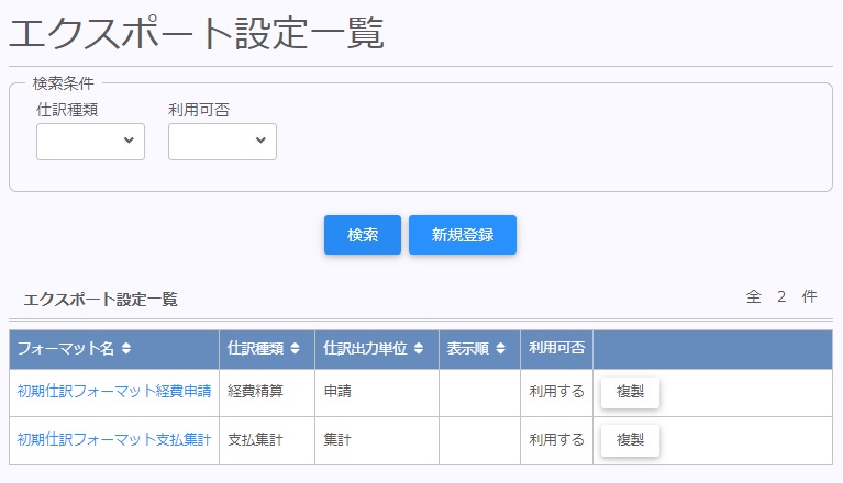 | 仕訳出力単位 | エクスポートされるデータが「明細」「申請」「集計」の単位で出力するかを設定します。 |