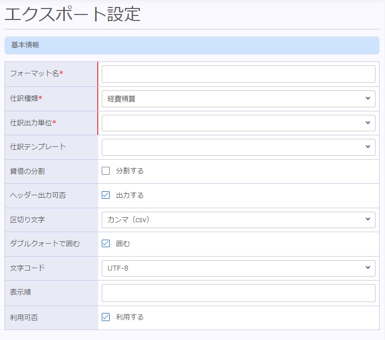 仕訳エクスポート時に出力されるCSVデータのフォーマットを設定します。