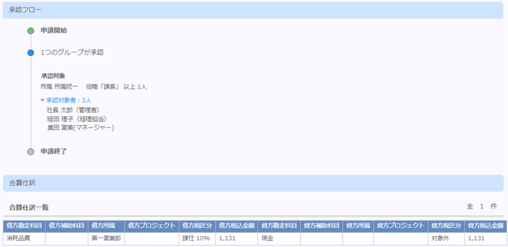 当該申請内容の承認フローを確認する事ができます。