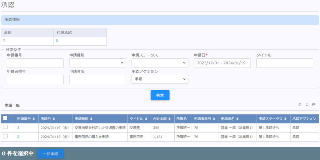 | 一括承認 | チェックボックスにチェックを付けた申請に対し、一括で承認を行います。 |