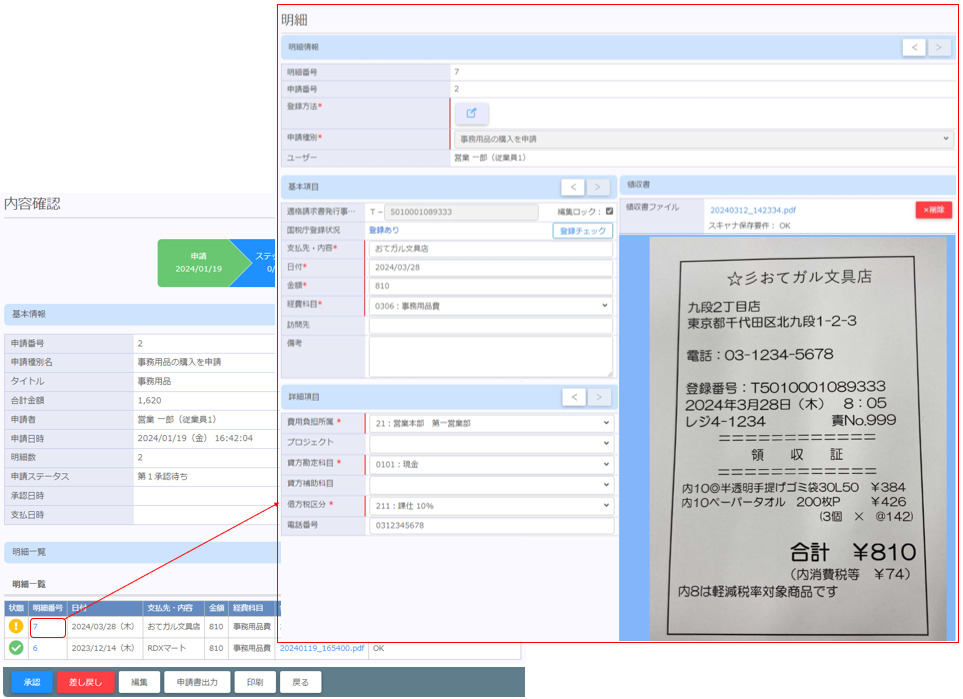 申請された経費に対し承認を行う画面です。