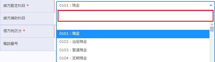 | 曖昧検索 | プルダウンにて選択をする際に枠が付いている場合、そちらへ文字を入力する事で必要な項目を検索する事が出来ます。 科目や銀行などの膨大な量の中から検索を行う際に有効な機能です。 |