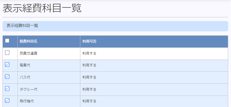 | チェックボックス | 表示対象となる経費科目にチェックを付けます。 項目名のボックスにチェックを入れる事で、全ての経費科目にチェックを付ける事ができます。 利用可否が「利用しない」になっている場合はチェックを付ける事ができません。この設定変更は科目設定の経費科目で行います。 |